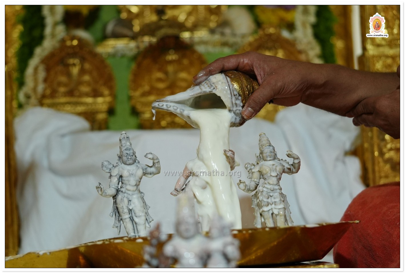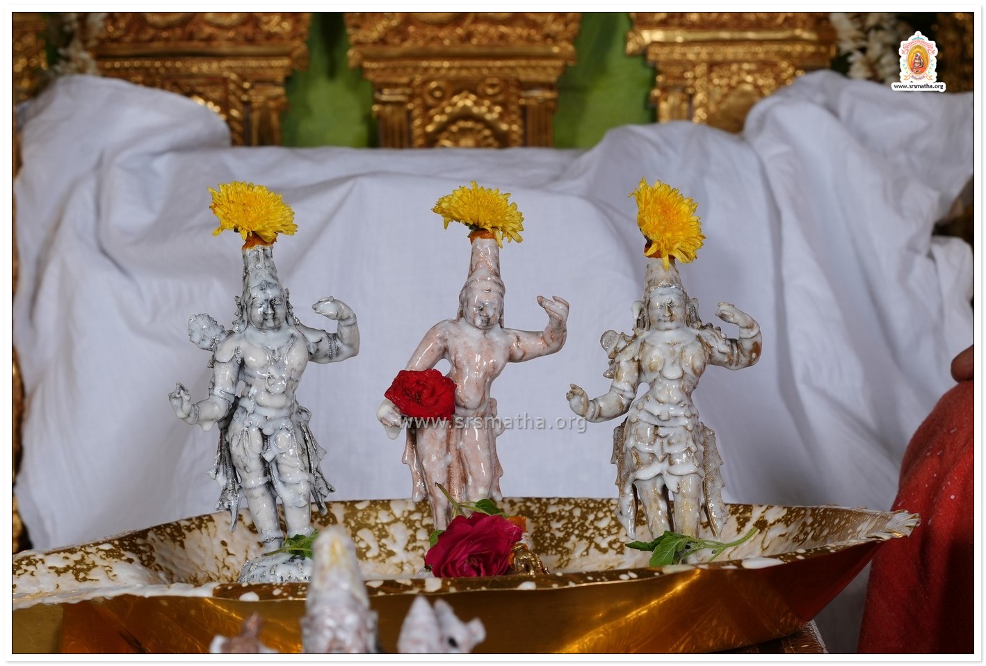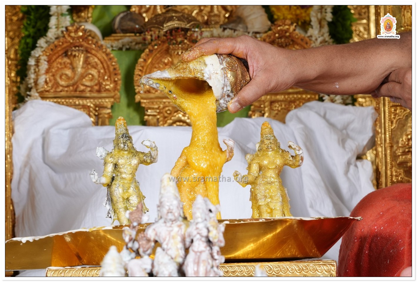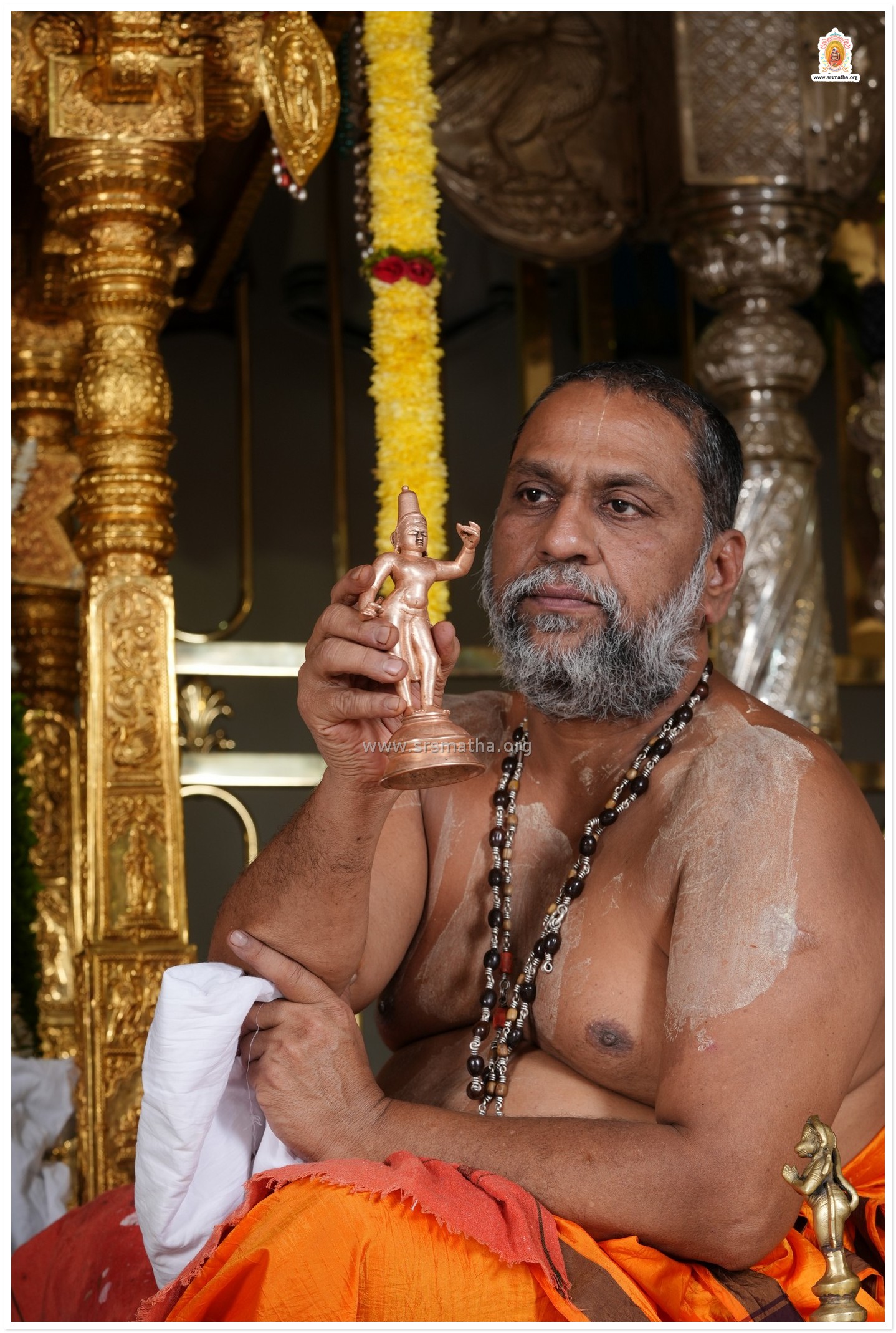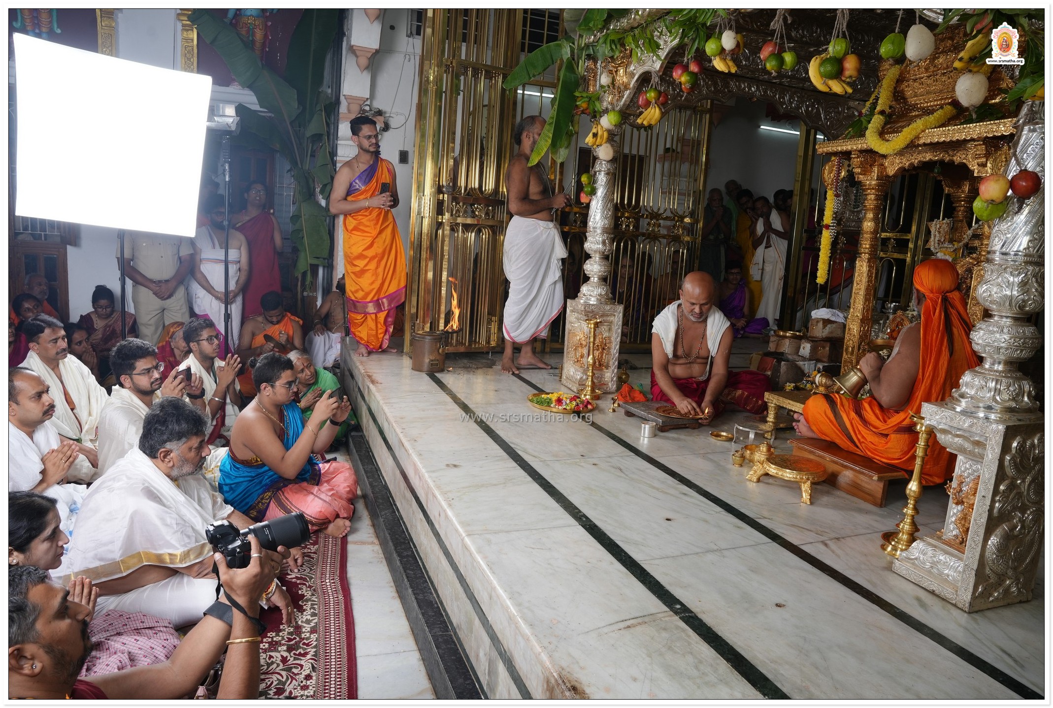 Following the Maha Abhisheka, His Holiness performed the sacred Gandha Lepana (application of sandal paste) to Sri Moola Ramadevaru, Sri Digvijaya Ramadevaru, and Sri Jayaramadevaru, and later conducted the Samsthana Pooja.