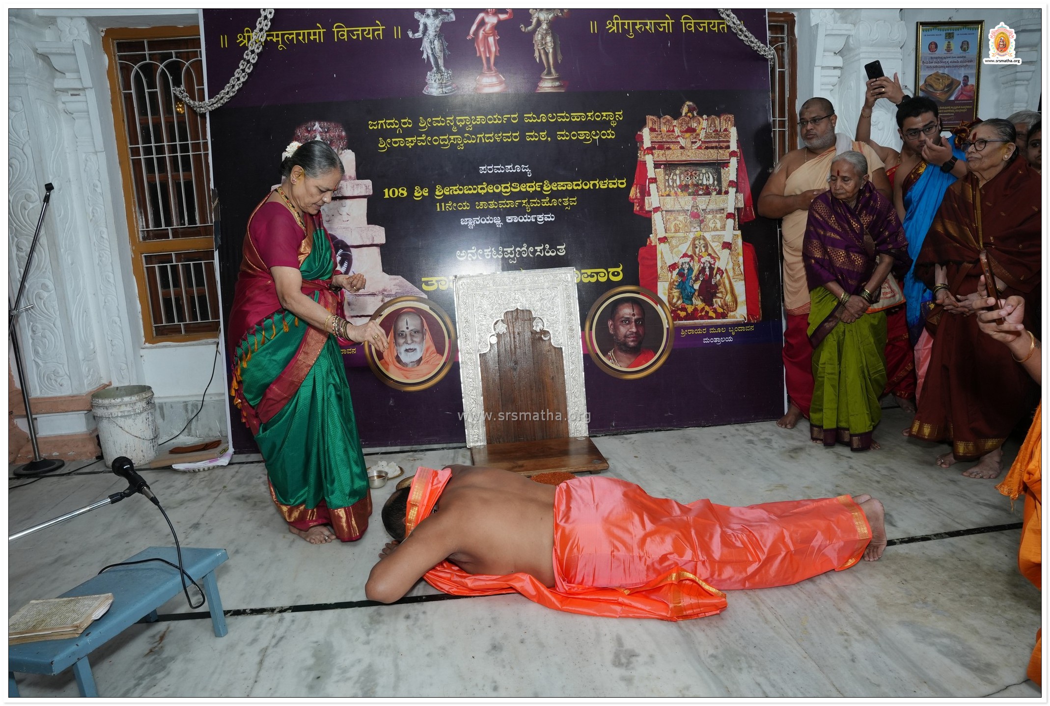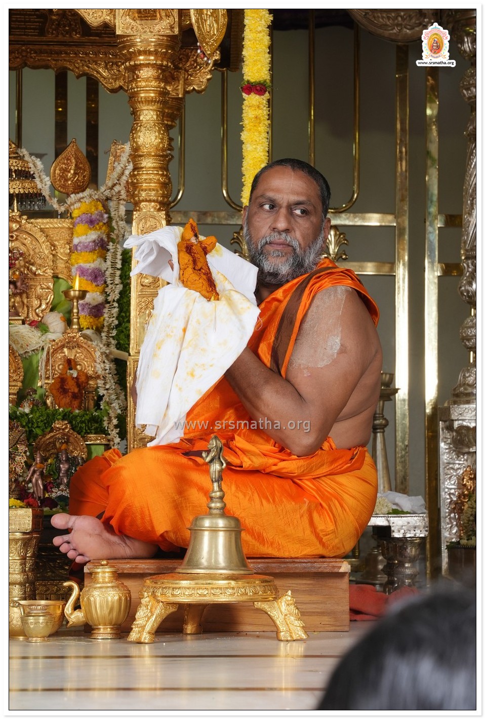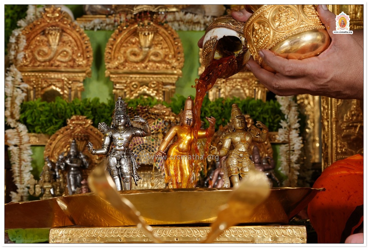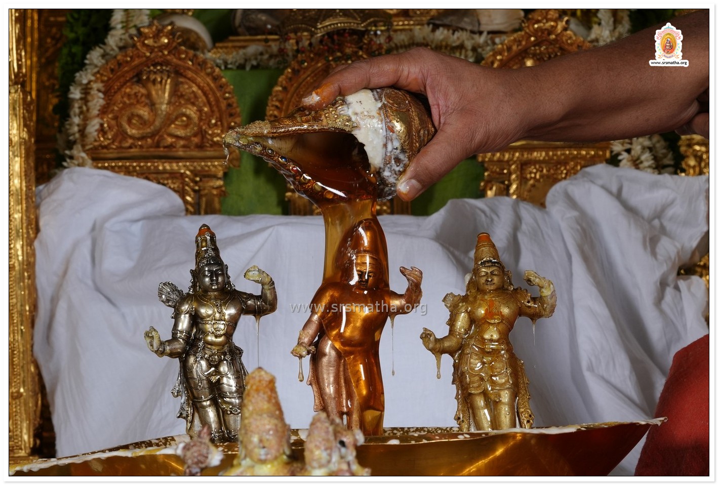 Following the Maha Abhisheka, His Holiness performed the sacred Gandha Lepana (application of sandal paste) to Sri Moola Ramadevaru, Sri Digvijaya Ramadevaru, and Sri Jayaramadevaru, and later conducted the Samsthana Pooja.