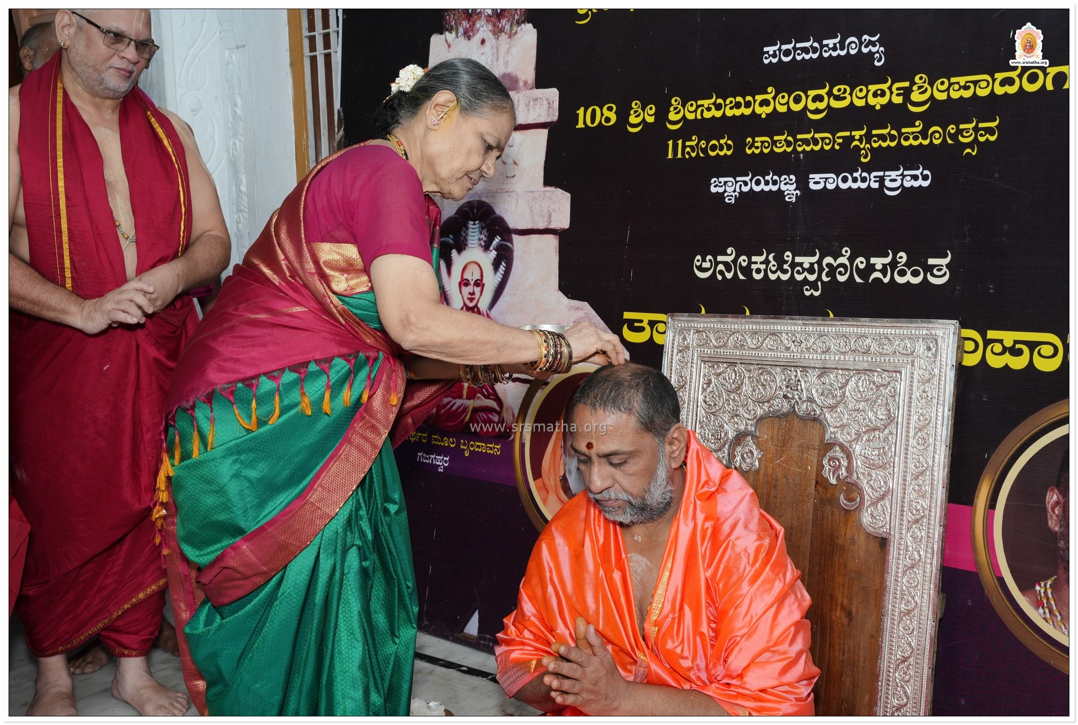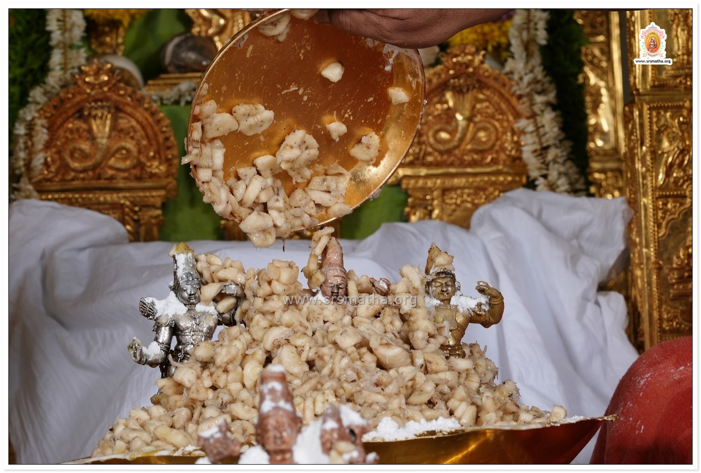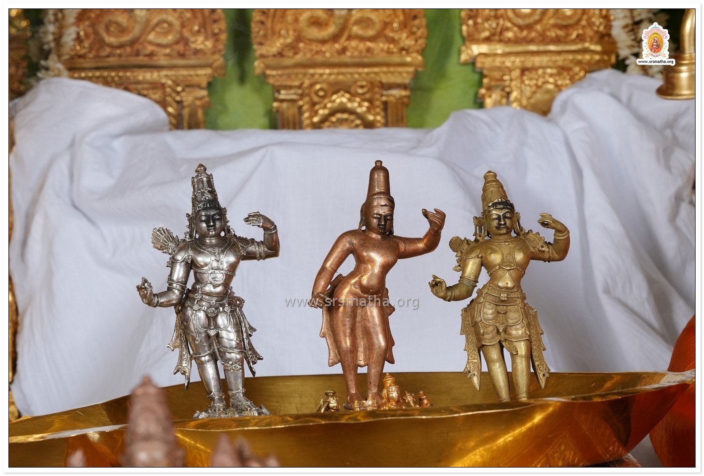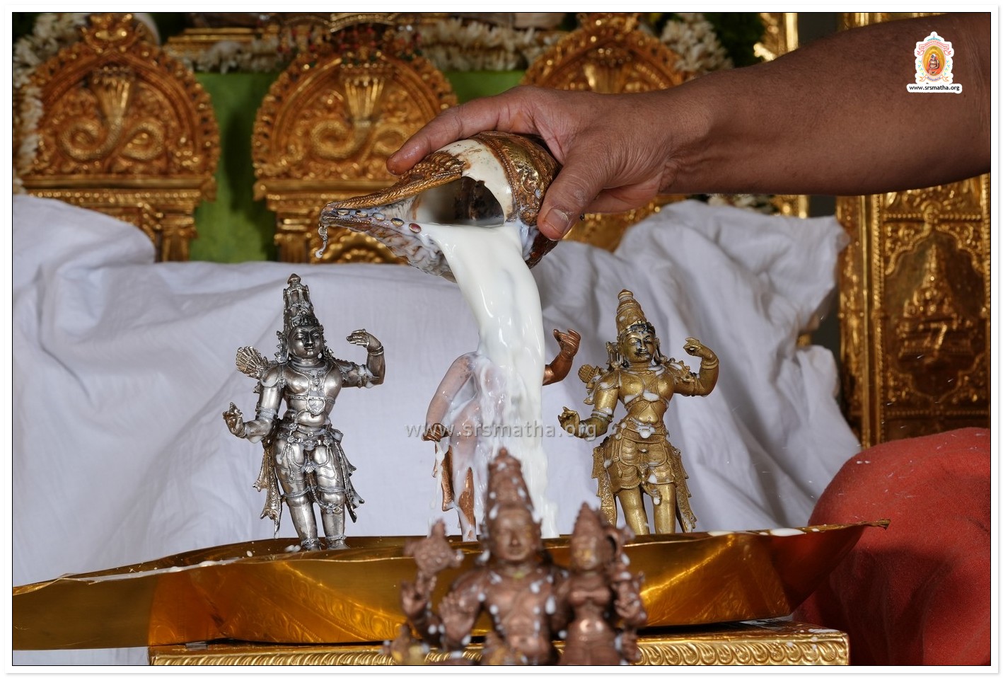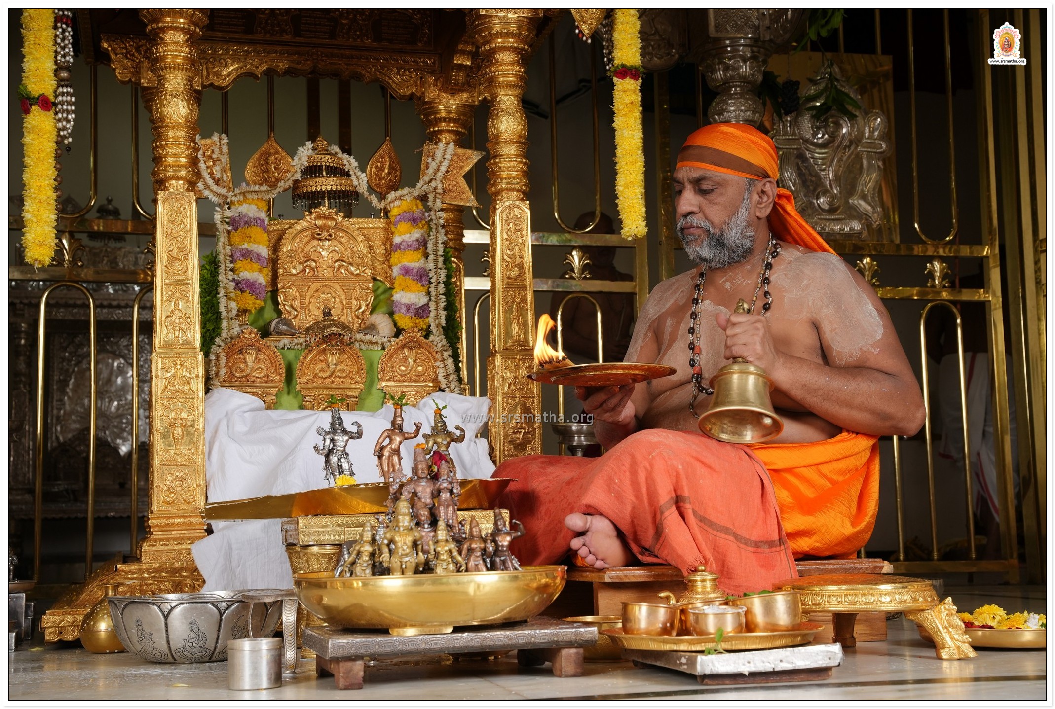 Following the Maha Abhisheka, His Holiness performed the sacred Gandha Lepana (application of sandal paste) to Sri Moola Ramadevaru, Sri Digvijaya Ramadevaru, and Sri Jayaramadevaru, and later conducted the Samsthana Pooja.