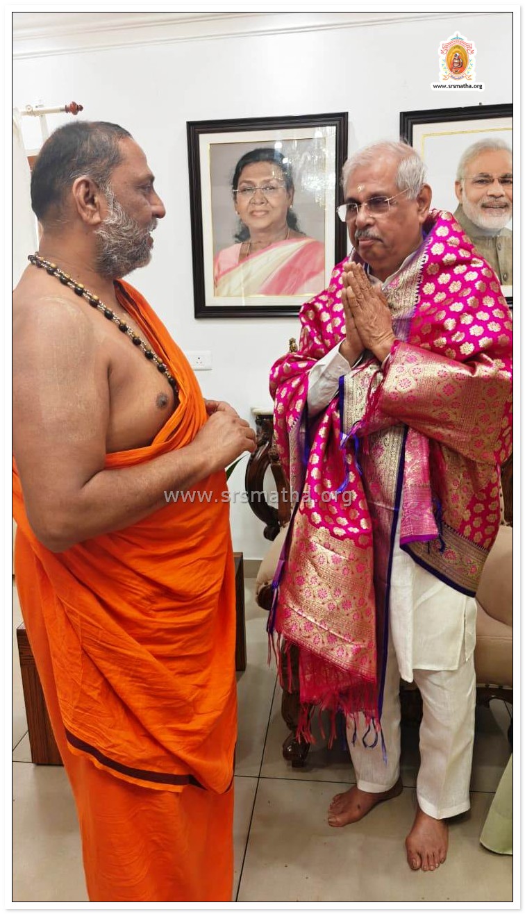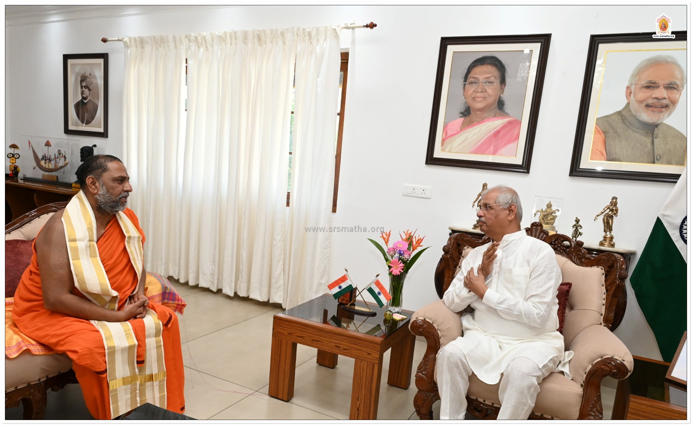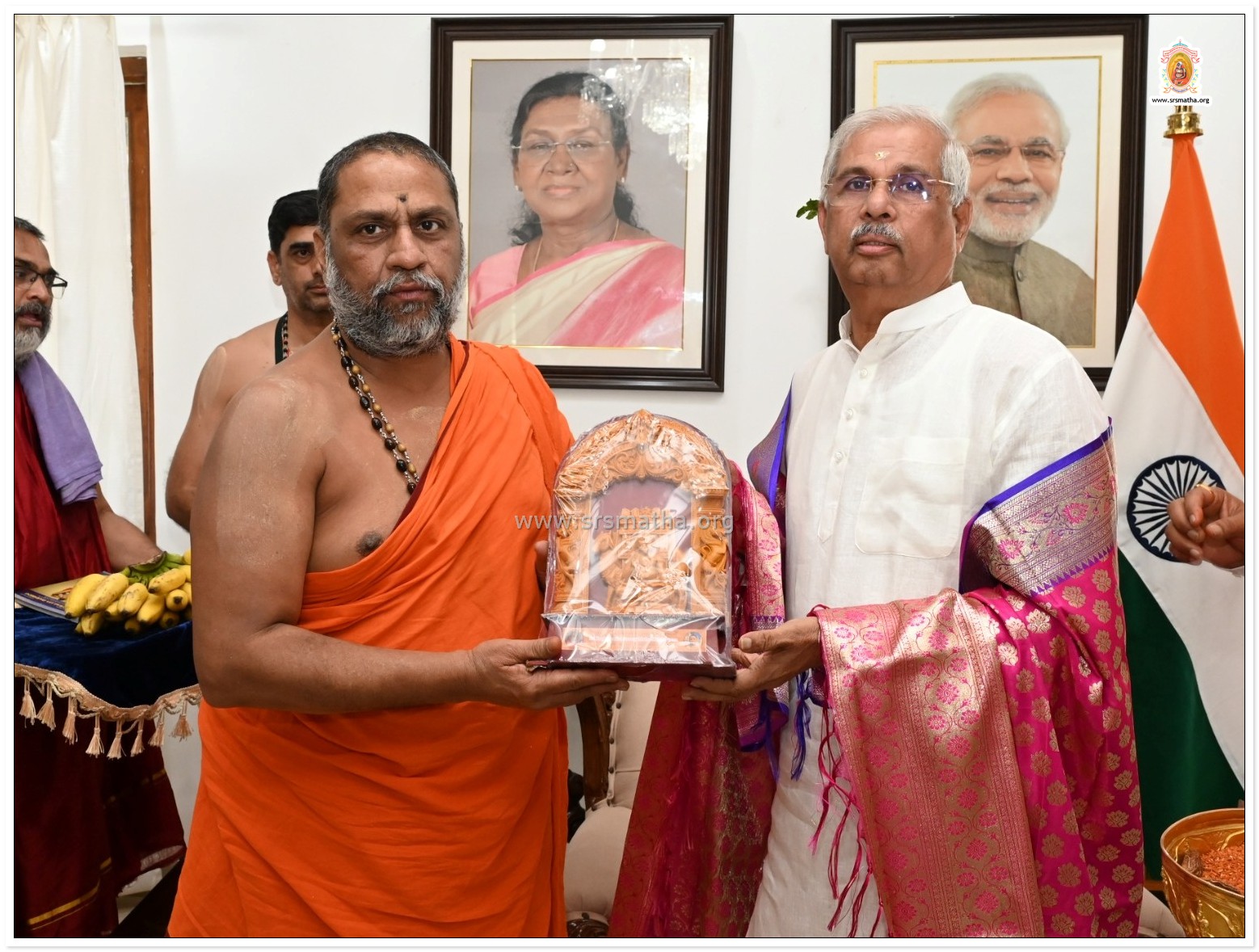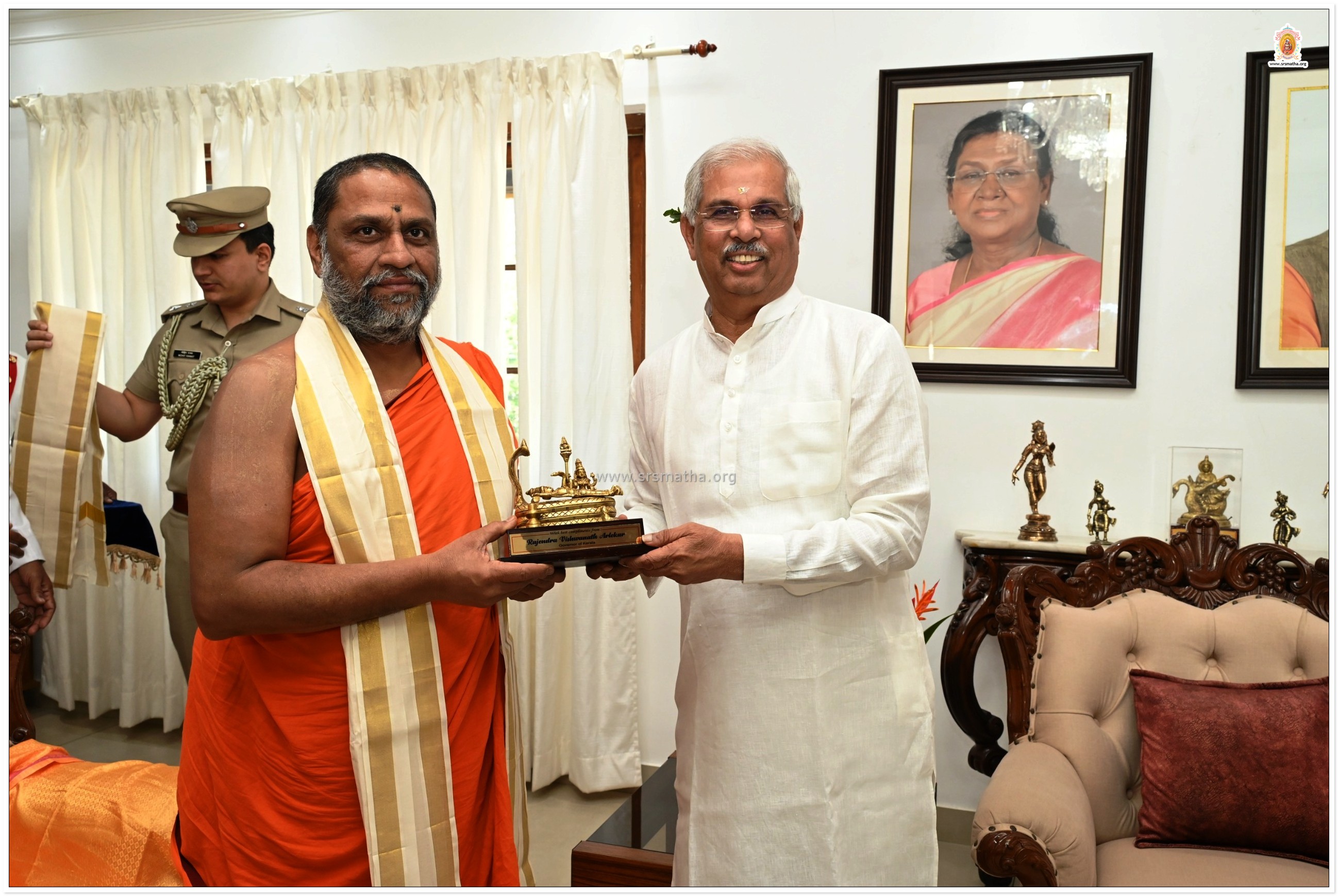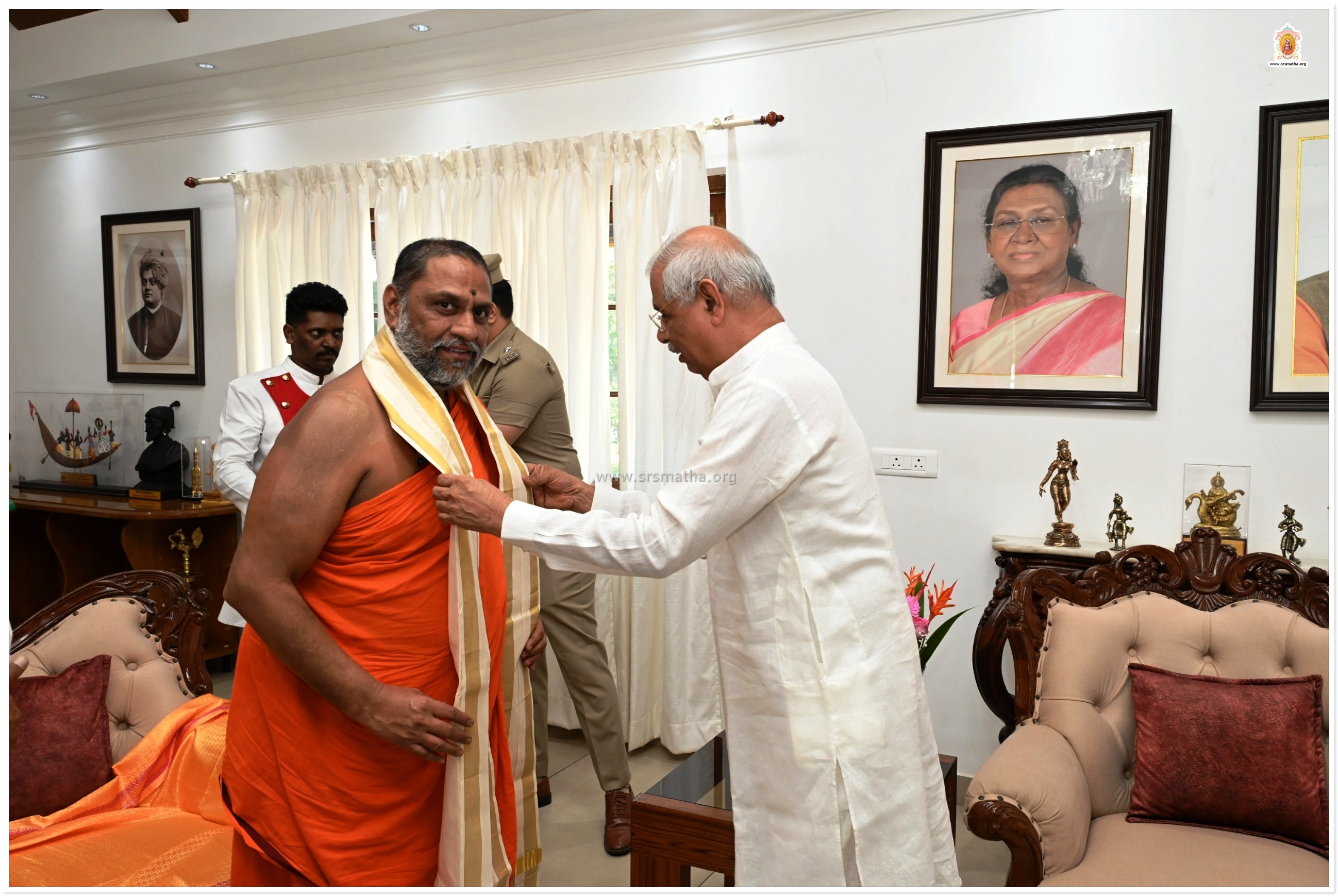 Subsequently, H.H. Sri Swamiji visited Raj Bhavan, Kerala, where He met the Hon’ble Governor of Kerala, Sri Rajendra Vishwanath Arlekar. The Hon’ble Governor felicitated H.H. Sri Swamiji, and H.H. Sri Swamiji blessed him with Sri Rayara Sheshavastra and Phala Mantrakshate