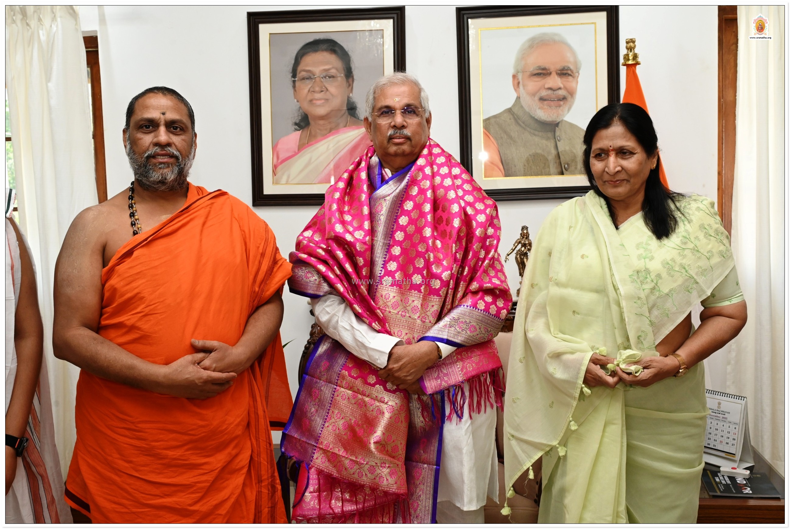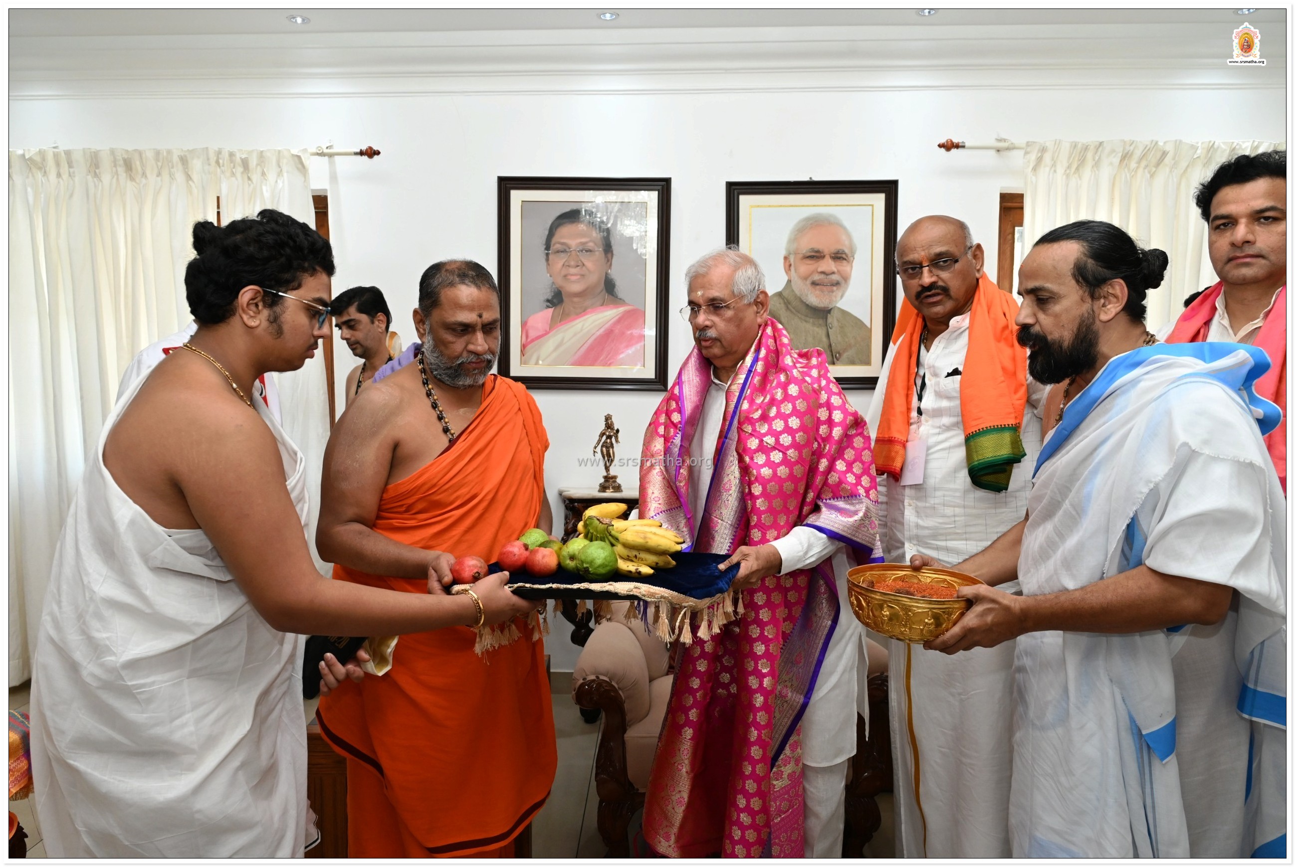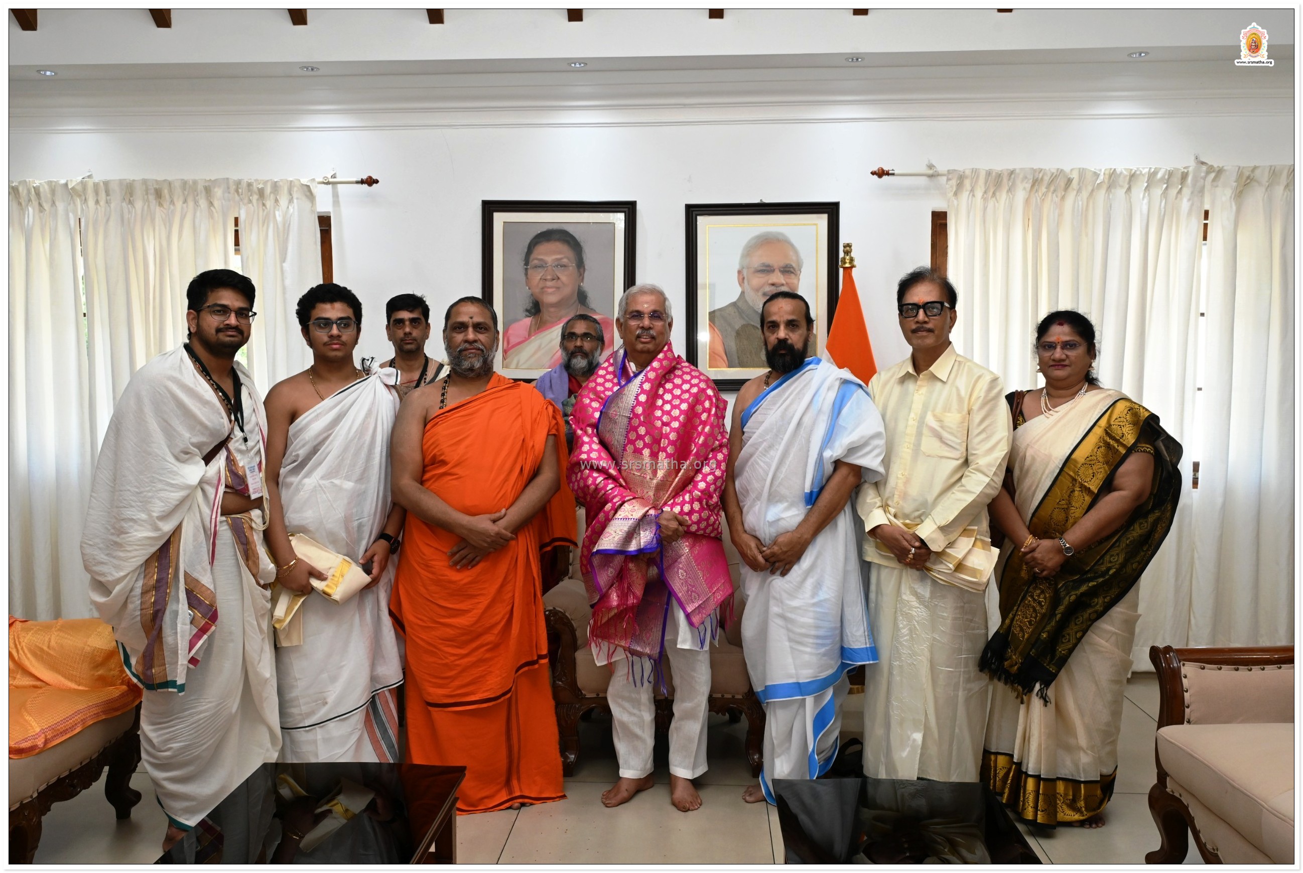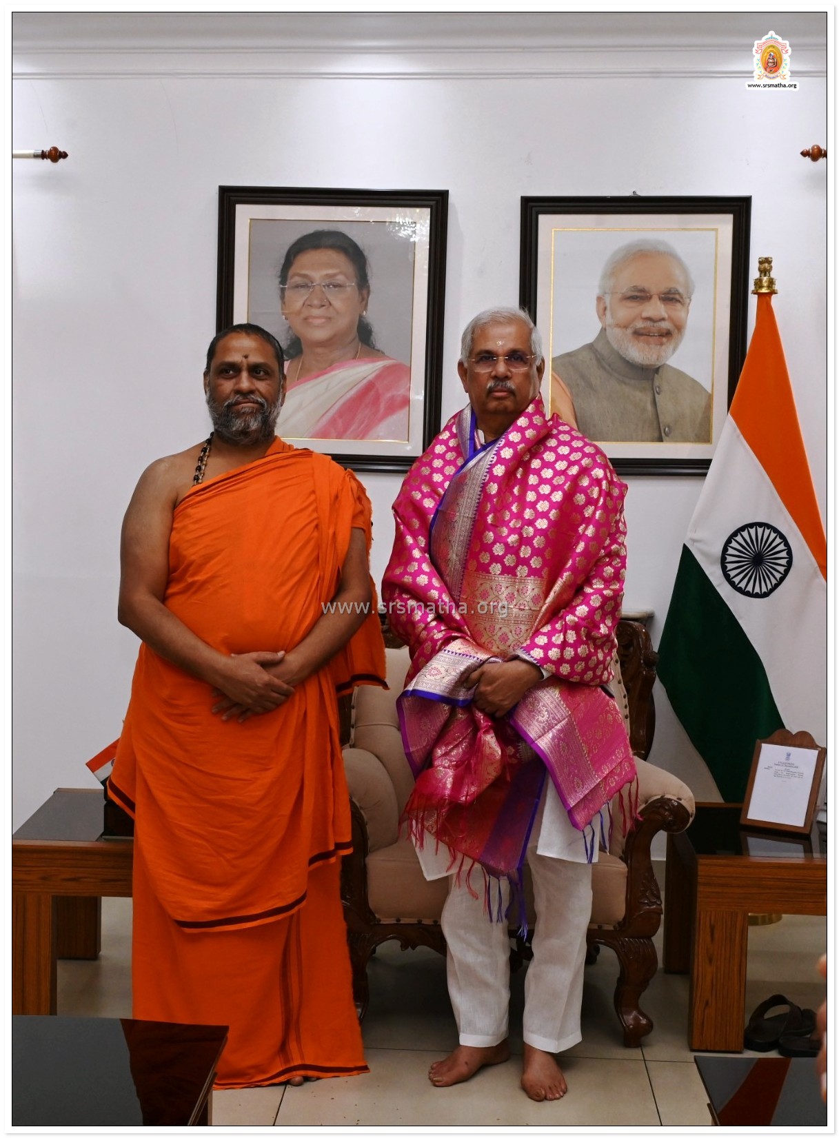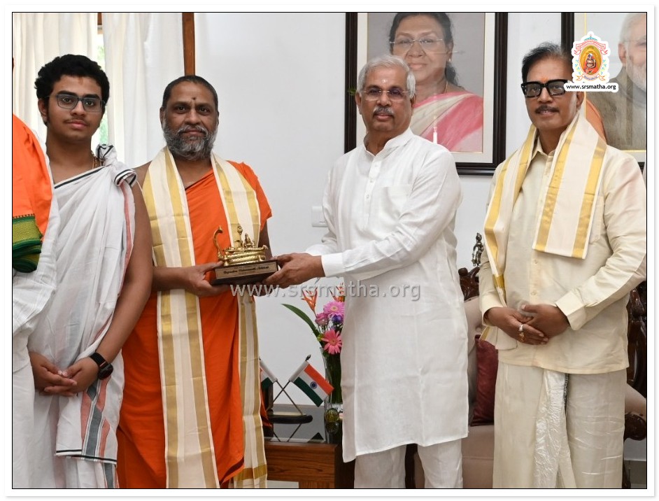 Subsequently, H.H. Sri Swamiji visited Raj Bhavan, Kerala, where He met the Hon’ble Governor of Kerala, Sri Rajendra Vishwanath Arlekar. The Hon’ble Governor felicitated H.H. Sri Swamiji, and H.H. Sri Swamiji blessed him with Sri Rayara Sheshavastra and Phala Mantrakshate