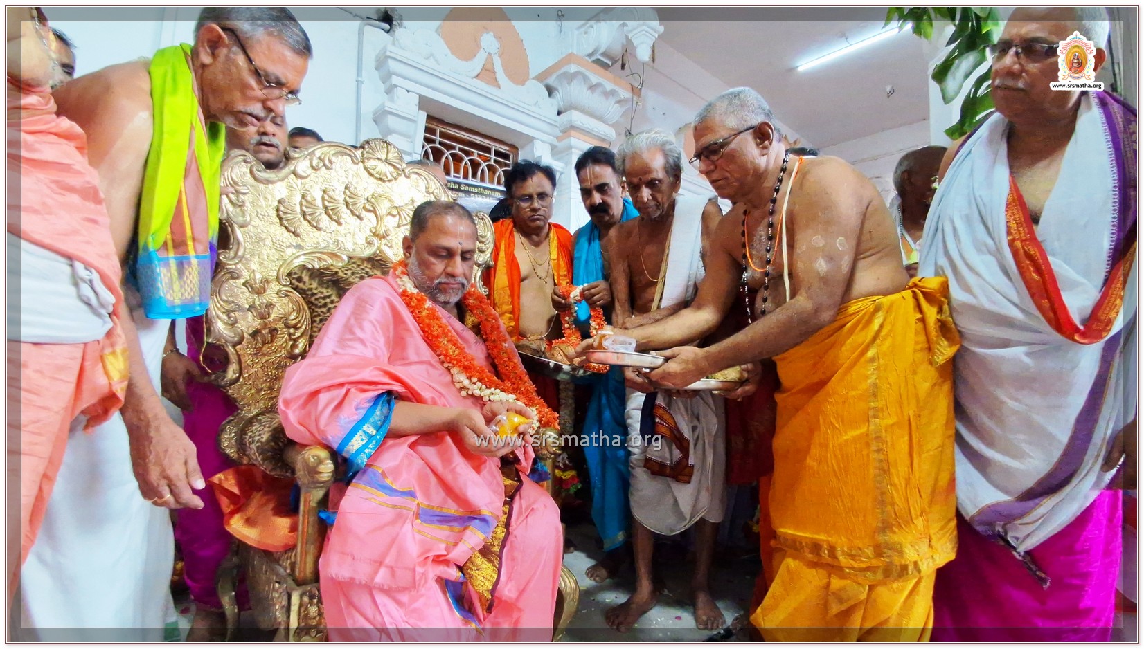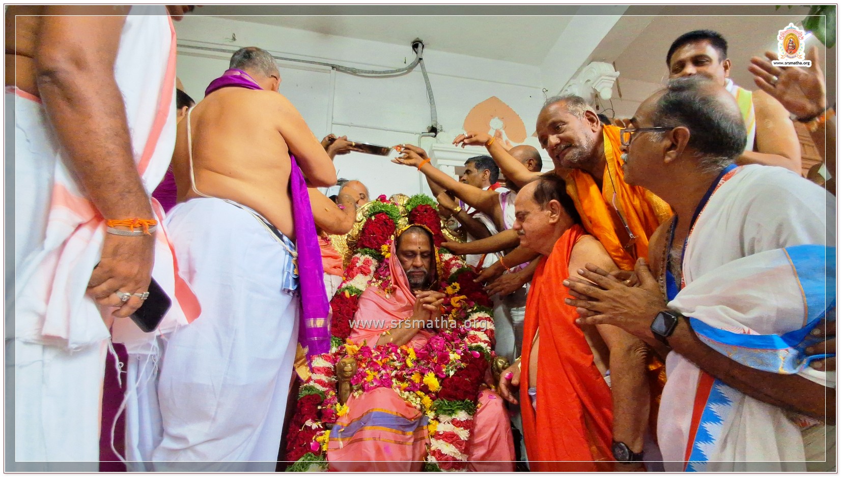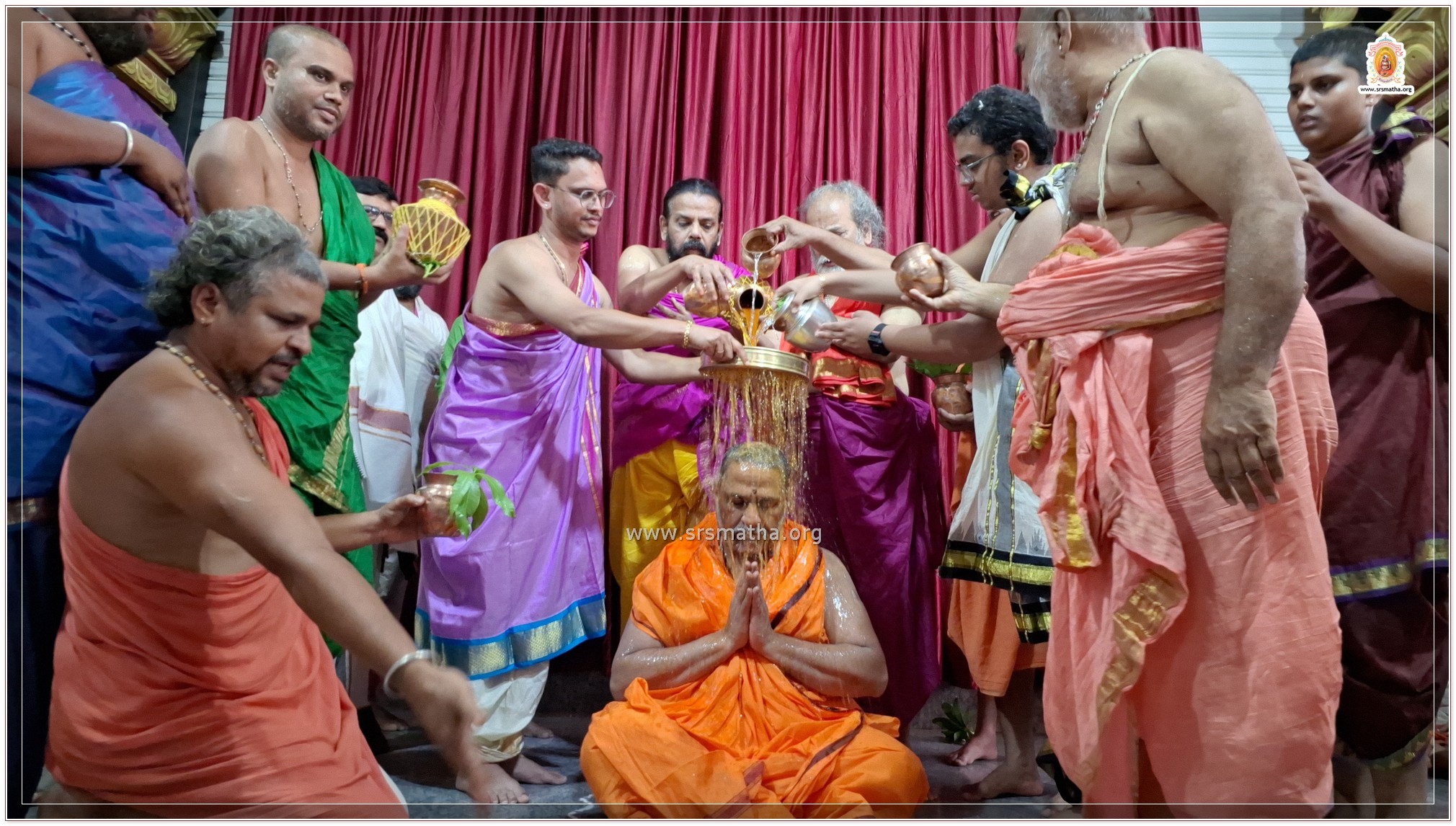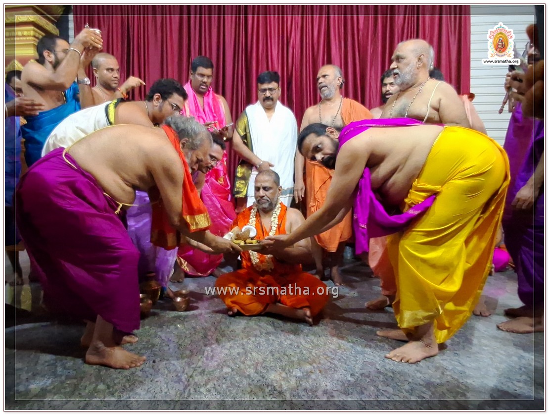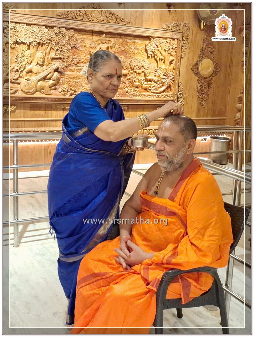 In the morning, Taila Abhyangana and Aarati were performed to H.H. Sri Swamiji by the students of SGS Vidyapeetha. The staff of Sri Mutt offered Guruvandana and Pushpavrushti in reverence.