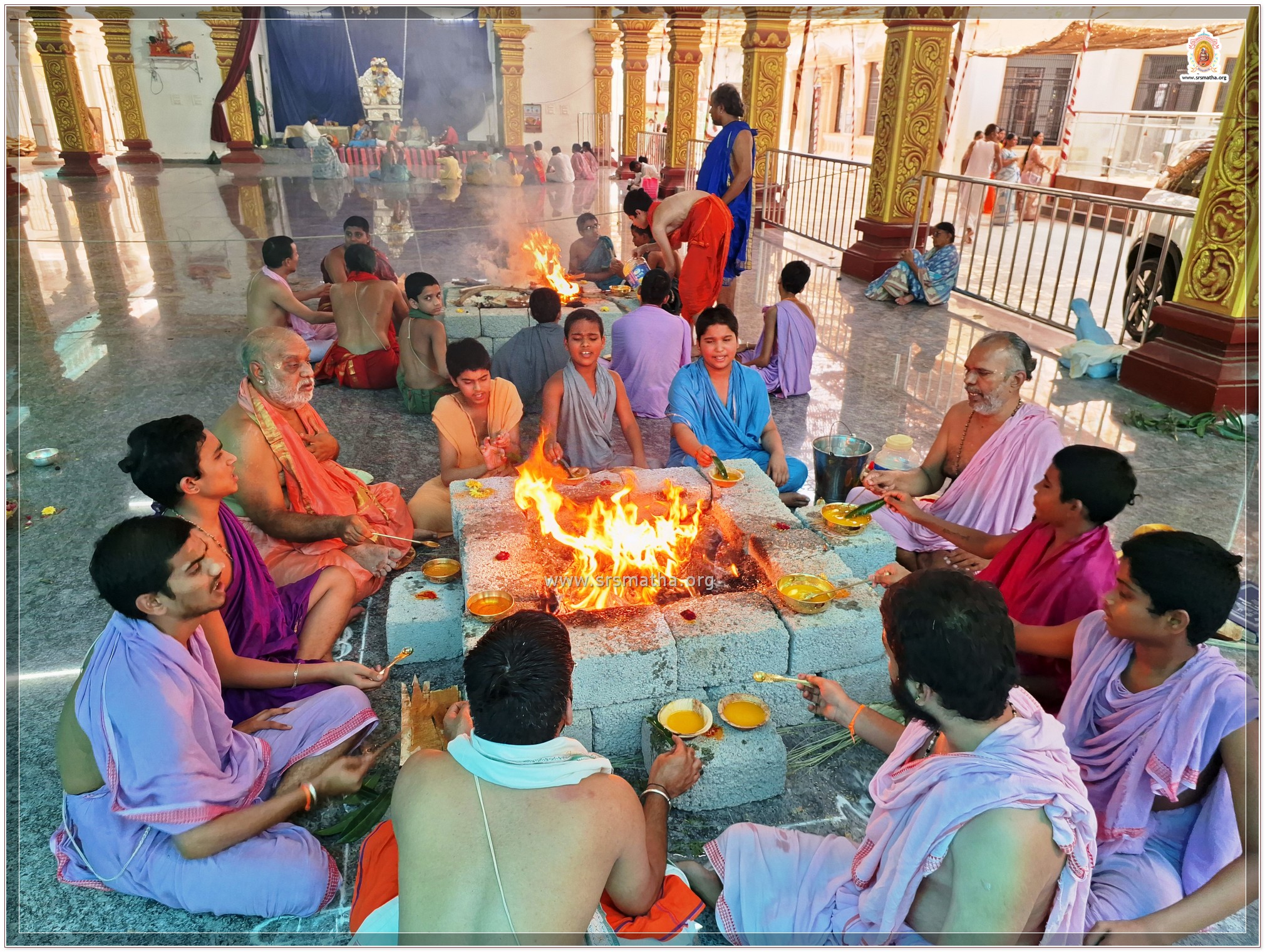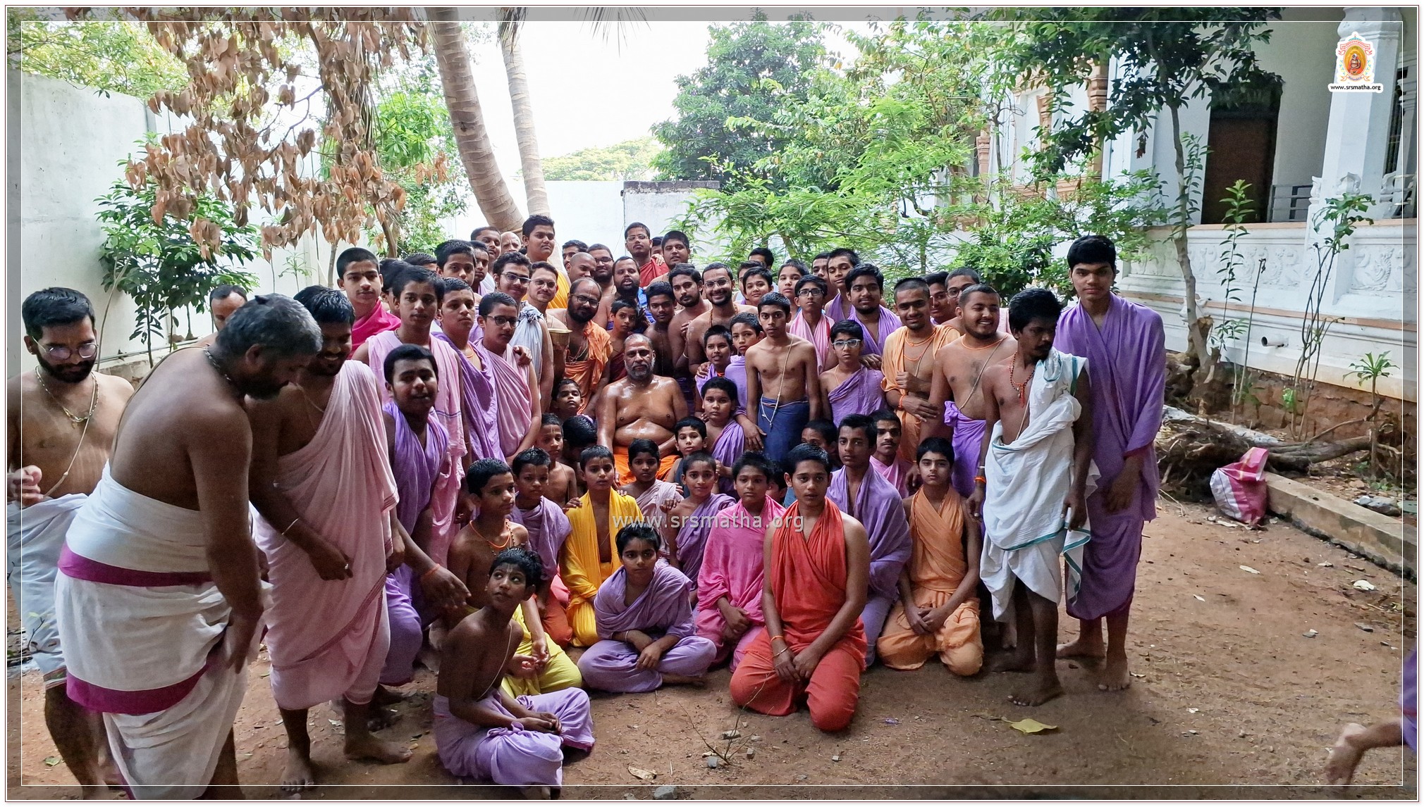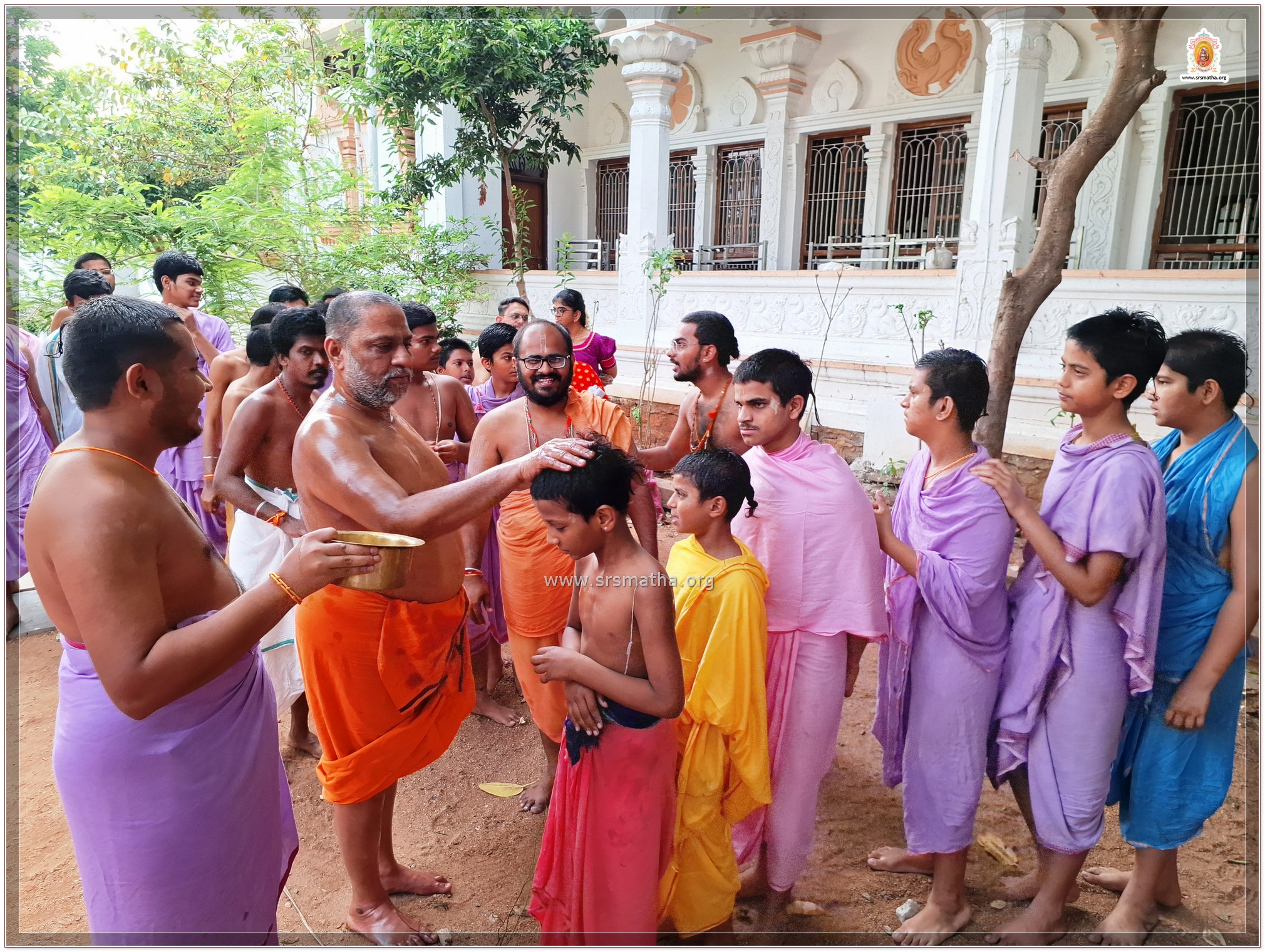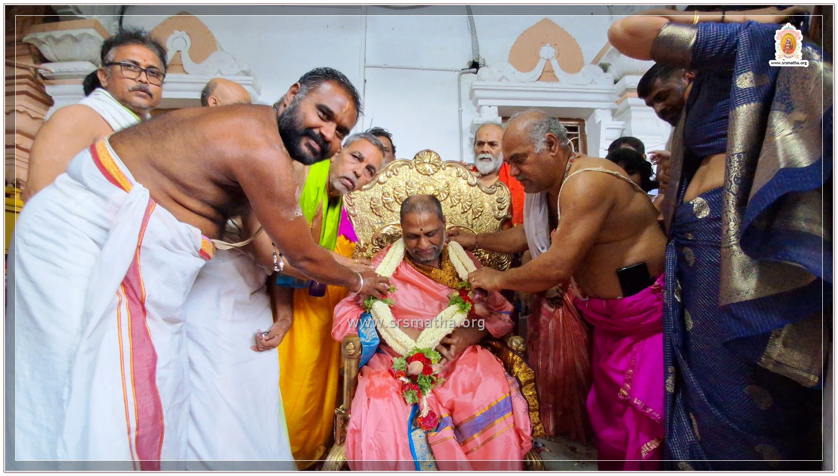 In the morning, Taila Abhyangana and Aarati were performed to H.H. Sri Swamiji by the students of SGS Vidyapeetha. The staff of Sri Mutt offered Guruvandana and Pushpavrushti in reverence.