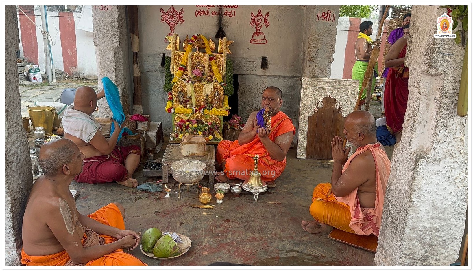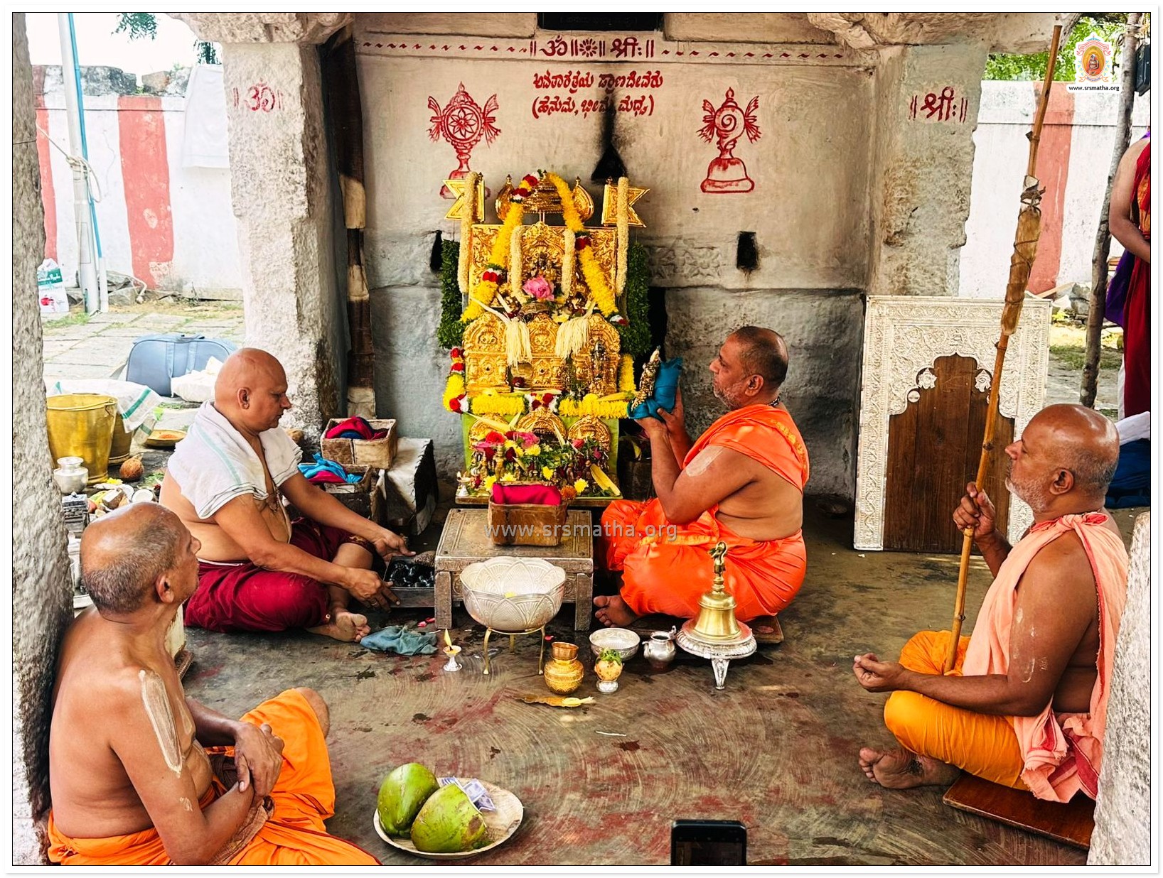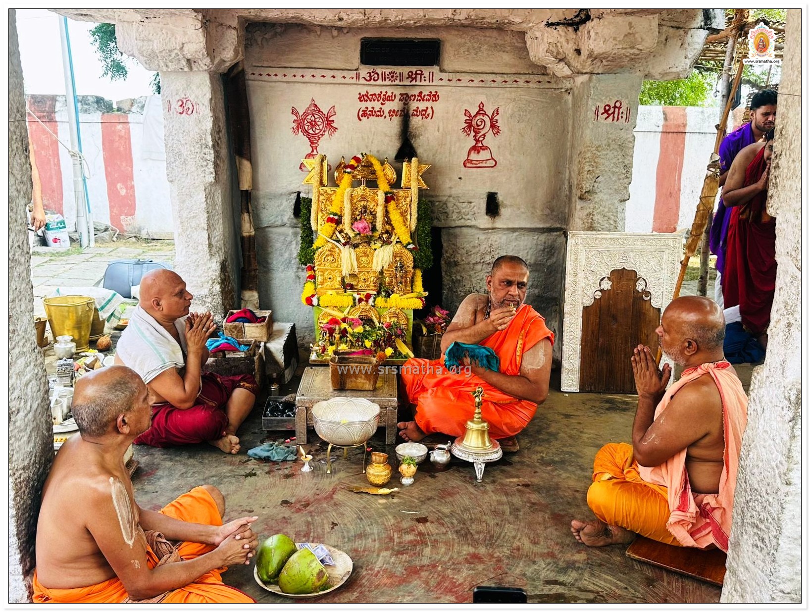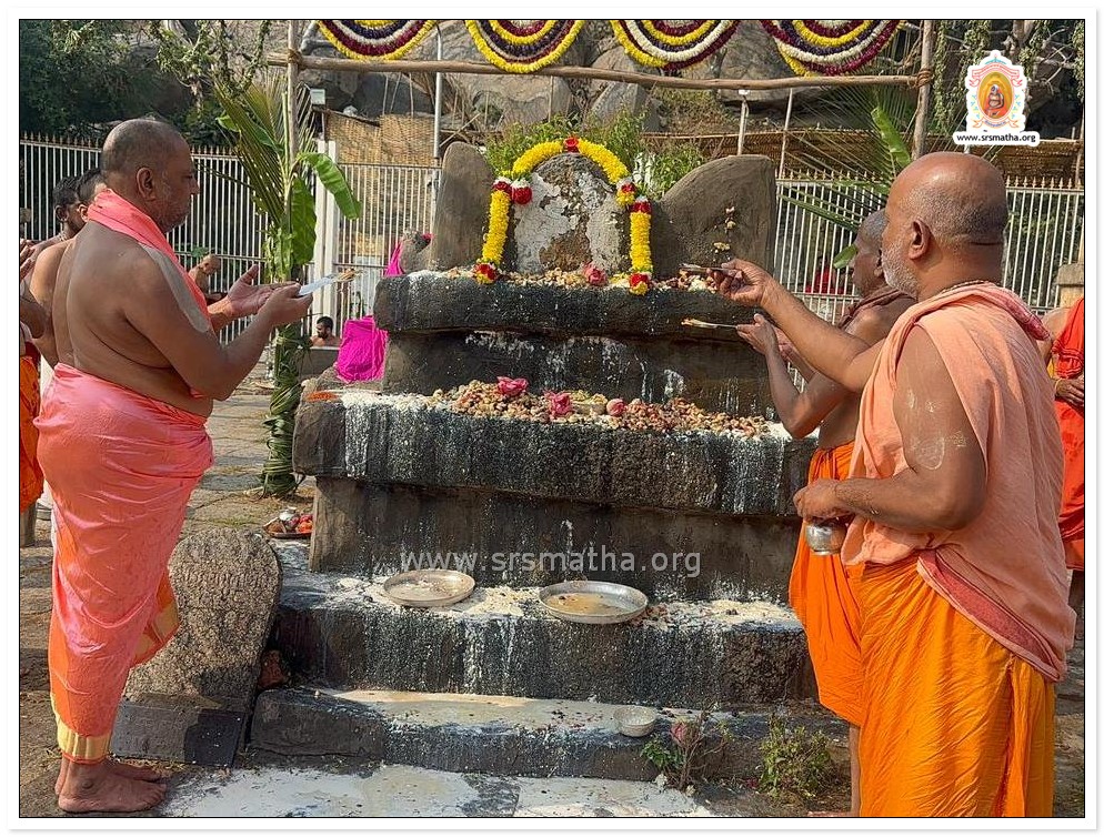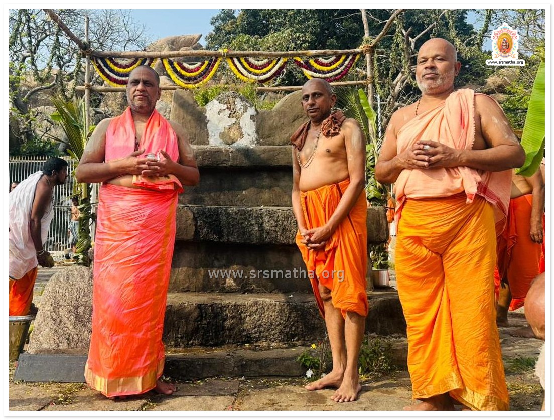 On the auspicious occasion of Sri Padmanabha Teerthara Madhyaradhana, H.H. Sri Subudhendra Teertha Swamiji, together with H.H. Sri Sujayanidhi Teertha Swamiji, Peethadipati of Sri Sripadaraja Mutt, and H.H. Sri Akshobhya Ramapriya Teertha Swamiji, Junior Pontiff of Sri Balagaru Mutt, performed the sacred Maha Panchamrutabhisheka to the Moola Brundavana of Sri Padmanabha Teertharu.
