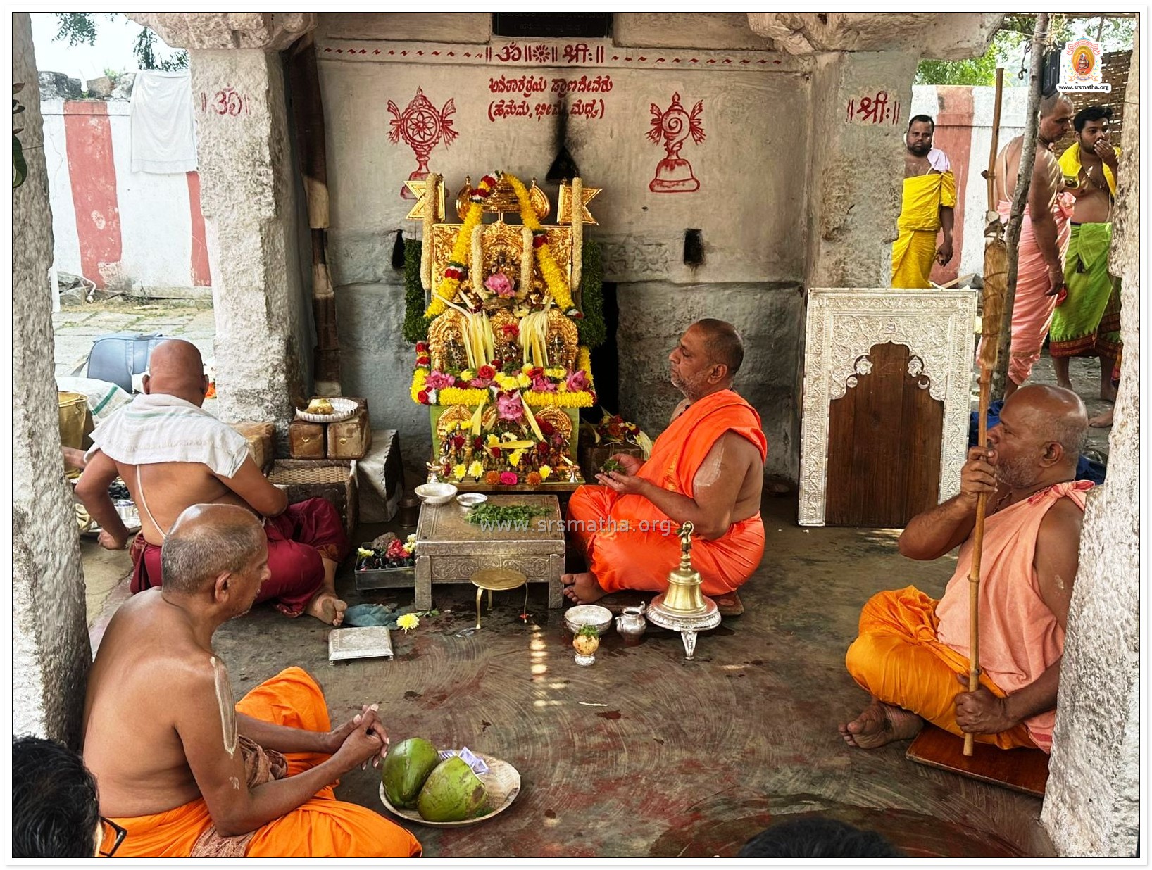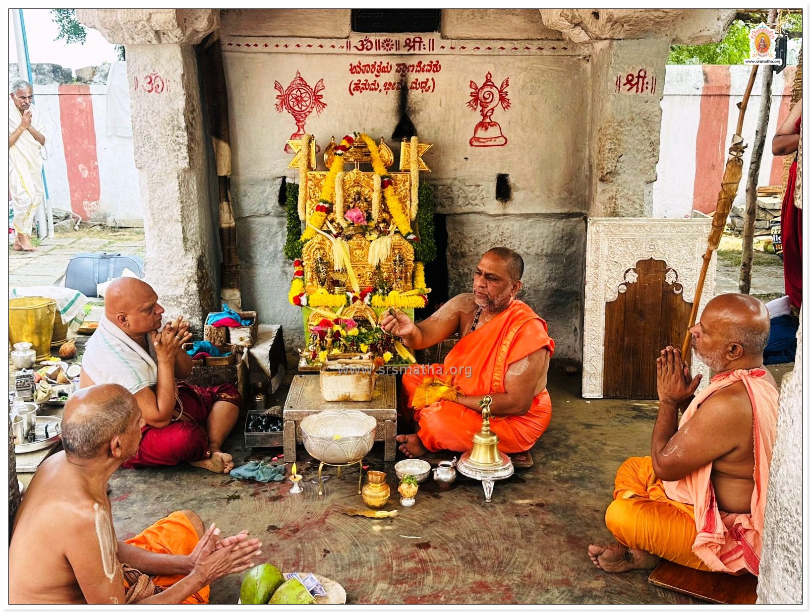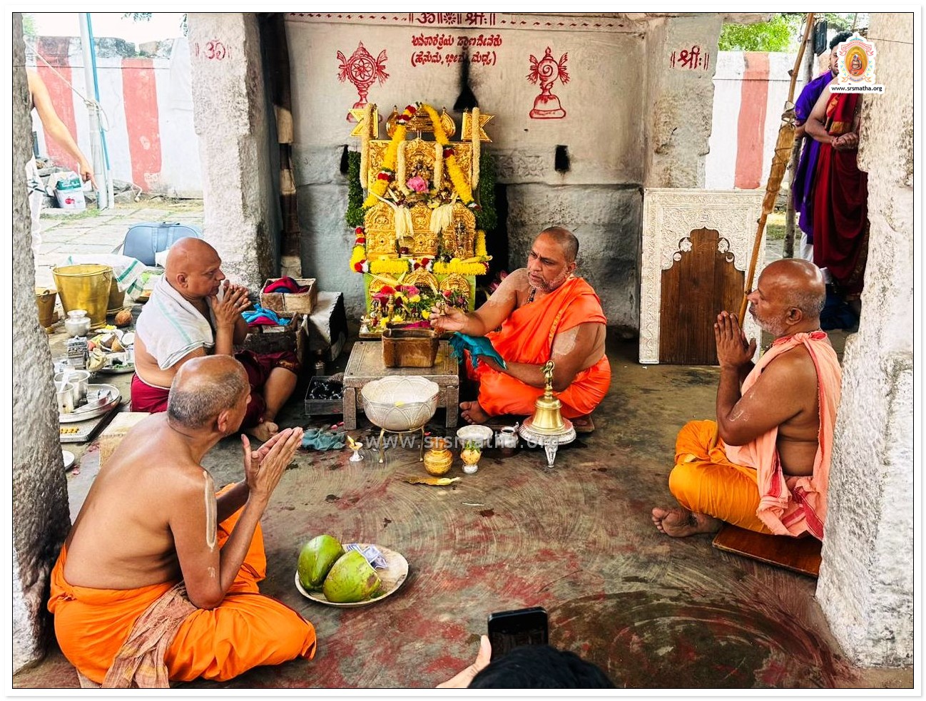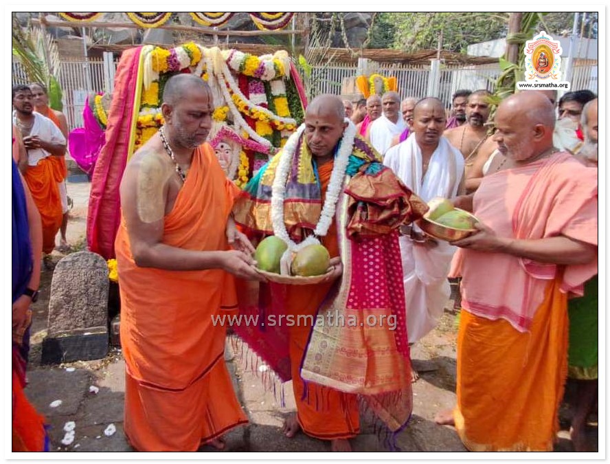 On the auspicious occasion of Sri Padmanabha Teerthara Madhyaradhana, H.H. Sri Subudhendra Teertha Swamiji, together with H.H. Sri Sujayanidhi Teertha Swamiji, Peethadipati of Sri Sripadaraja Mutt, and H.H. Sri Akshobhya Ramapriya Teertha Swamiji, Junior Pontiff of Sri Balagaru Mutt, performed the sacred Maha Panchamrutabhisheka to the Moola Brundavana of Sri Padmanabha Teertharu.