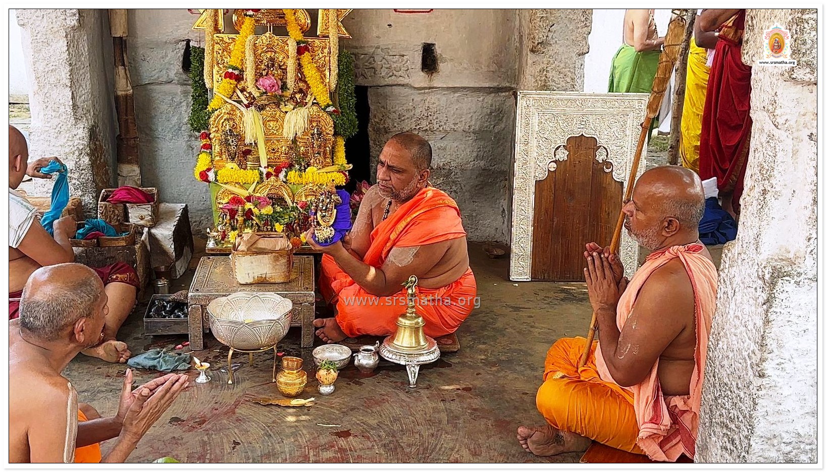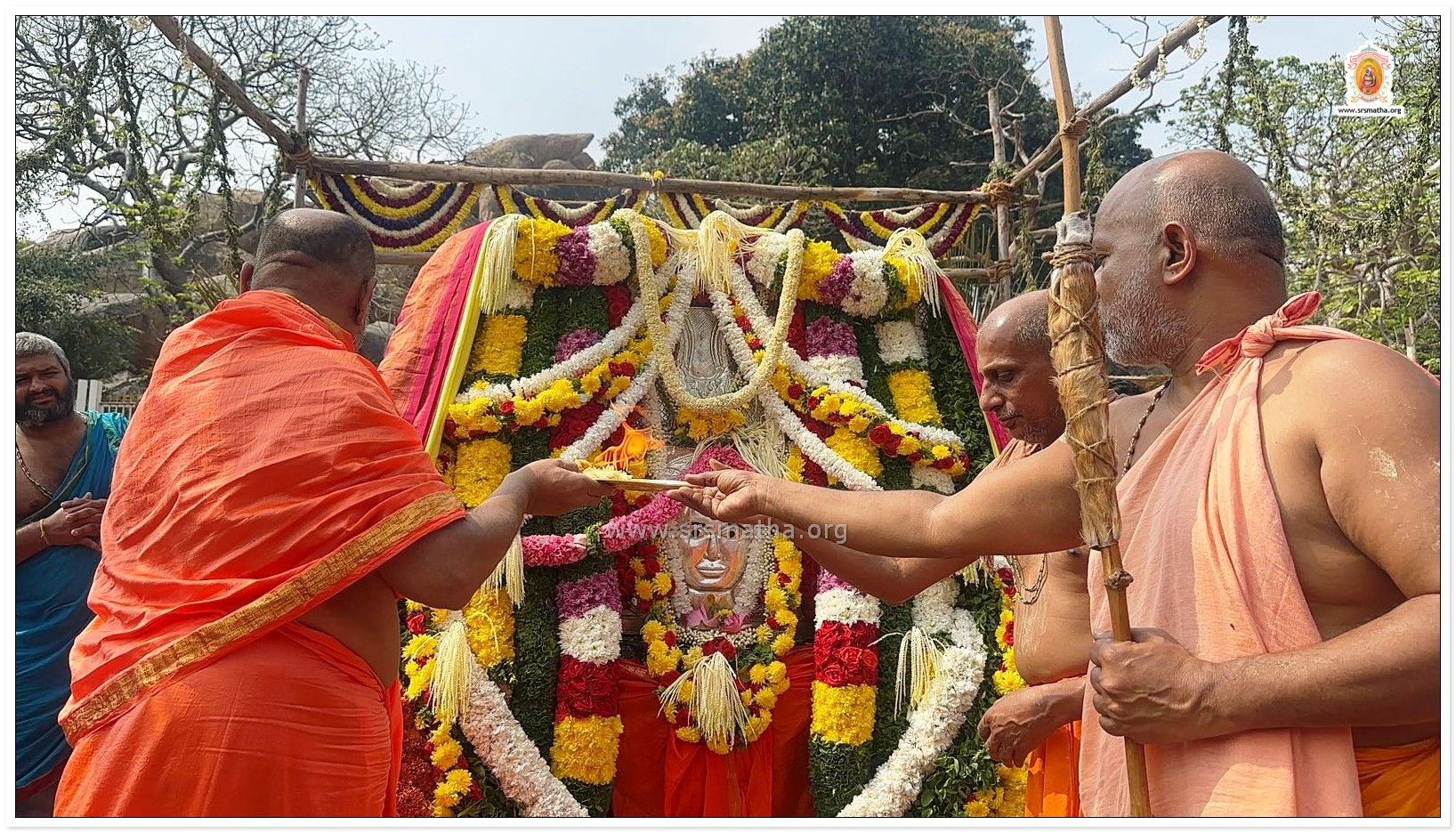 Following this, H.H. Sri Subudhendra Teertha Swamiji performed Sri Chaturmukha Brahma Kararchita Moola Ramadevara Pooja, culminating with the auspicious Maha Mangalarati at the Moola Brundavana of Sri Padmanabha Teertharu.
