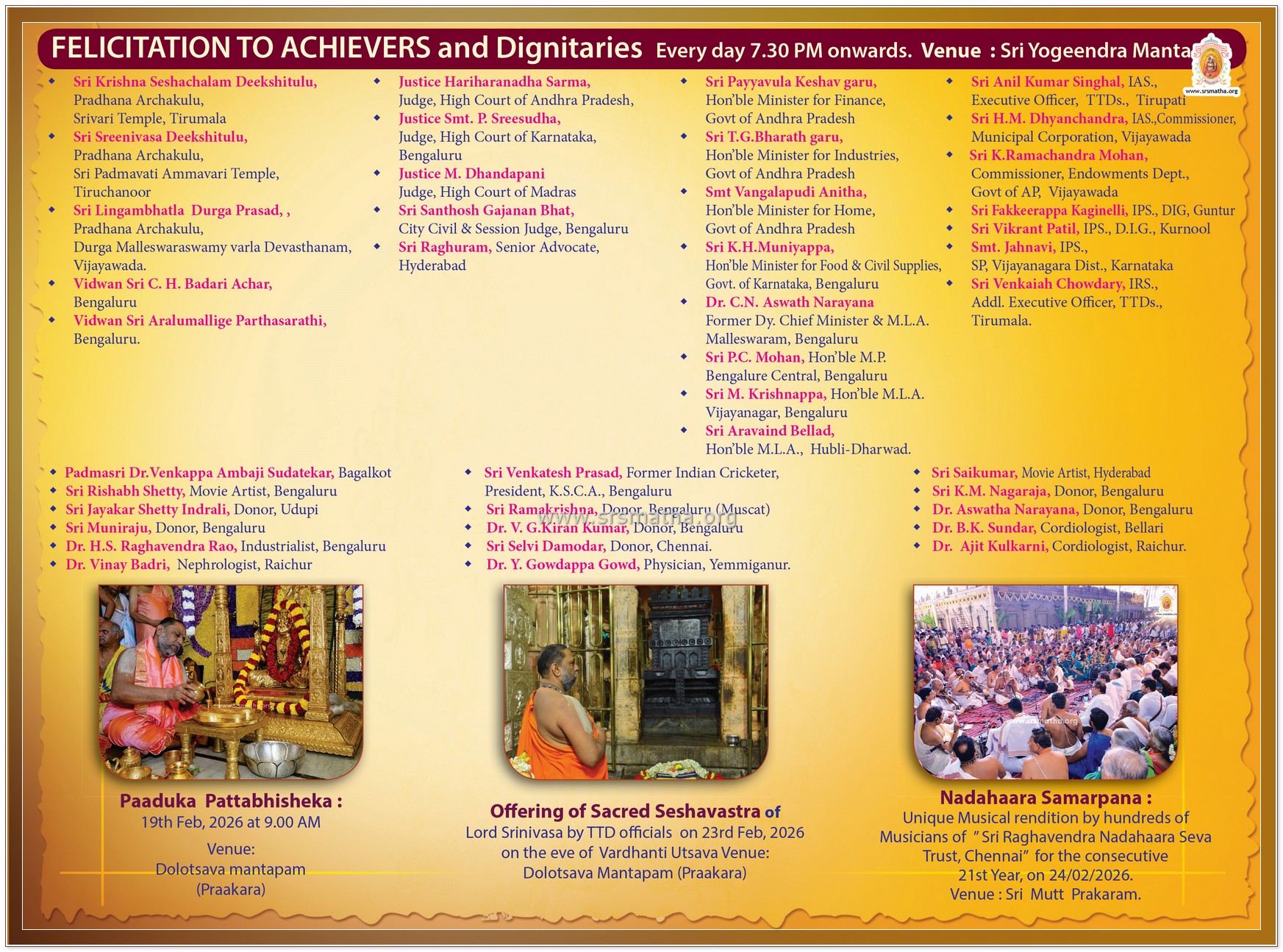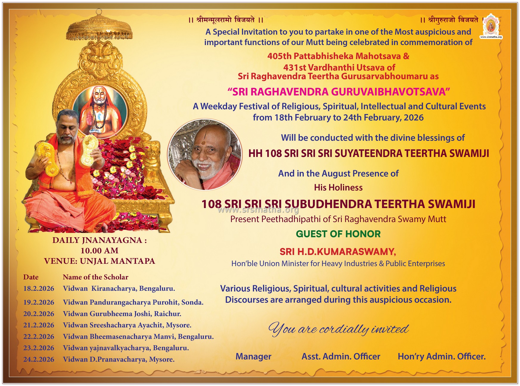 With the blessings of Paramapujya H.H.Dr 108 Sri Subudhendra Teertha Swamiji, let us celebrate Guru Vaibhavotsava-The 405th Pattabhisheka mahostava and 431st Vardanthi utsava (birthday) of Sri Rayaru from 18.02.2026 to 24-02-2026. It is in this context we are enclosing herewith the invitation card.