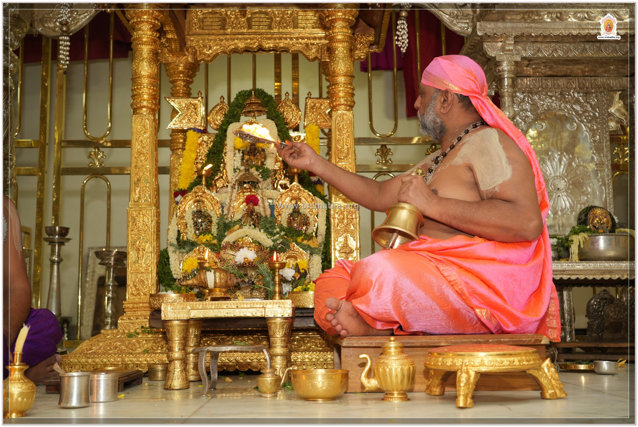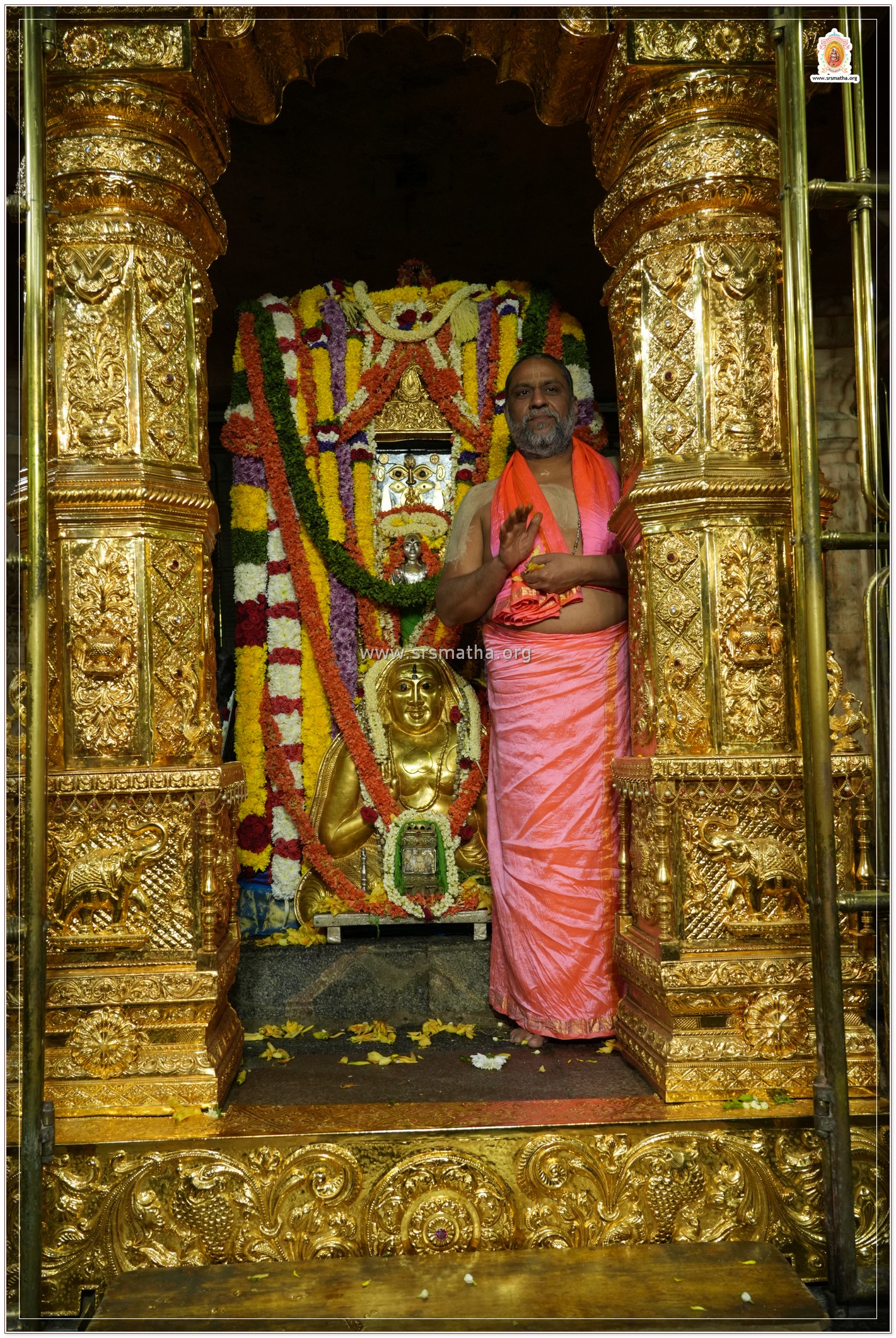 On the auspicious occasion of Sri Raghavendra Swamigalavara Pattabhisheka Mahotsava, H.H. Sri Swamiji reverentially performed the Pattabhisheka Mahotsava to the sacred Moola Padukas of Sri Raghavendra Swamigalavaru. As part of this sacred ceremony, H.H. Sri Swamiji offered Pushpabhisheka, Kanakabhisheka, and Ratnabhisheka to Sri Rayara Padukas. H.H. Sri Swamiji inaugurated Sri Parabhava Nama samvatsara panchanga in 4 languages(Telugu, Tamil,Kannada adn english). Sri Matha will distribute these panchangas free of cost to the disciples of Sri Matha. Later, the grand Sri Rayara Rathotsavam was conducted in the holy precincts of the Sri Mutt Prakaram, filling the atmosphere with devotion and spiritual fervour. H.H. Sri Swamiji also gave a holy start to Hindu utsava procession on occasion of Chatrapati Shivaji Maharaj Jayanti.